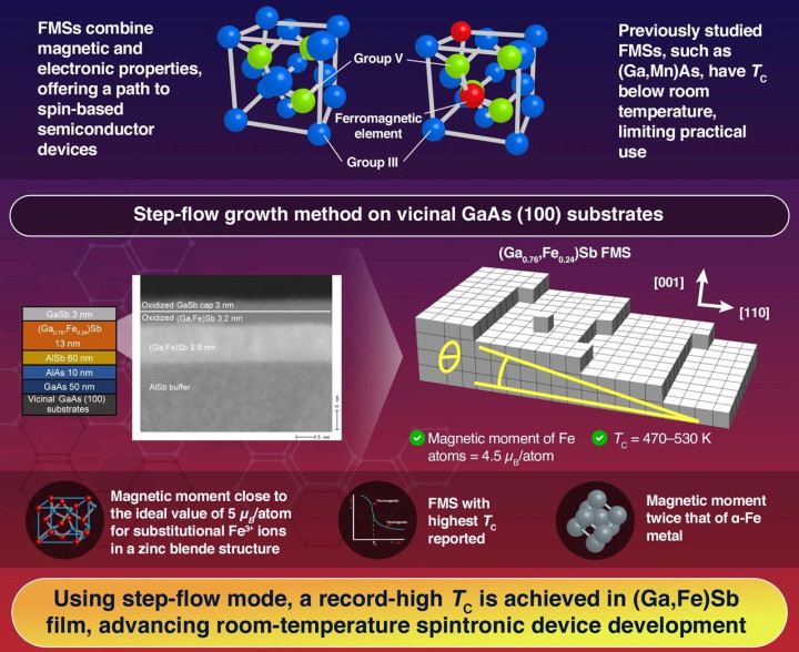 凭借这一技术,团队创建了(Ga₀.₇₆Fe₀.₂₄)Sb薄膜,其居里温度在470K至530K之间,这是FMS研究中迄今为止报道的最高值。